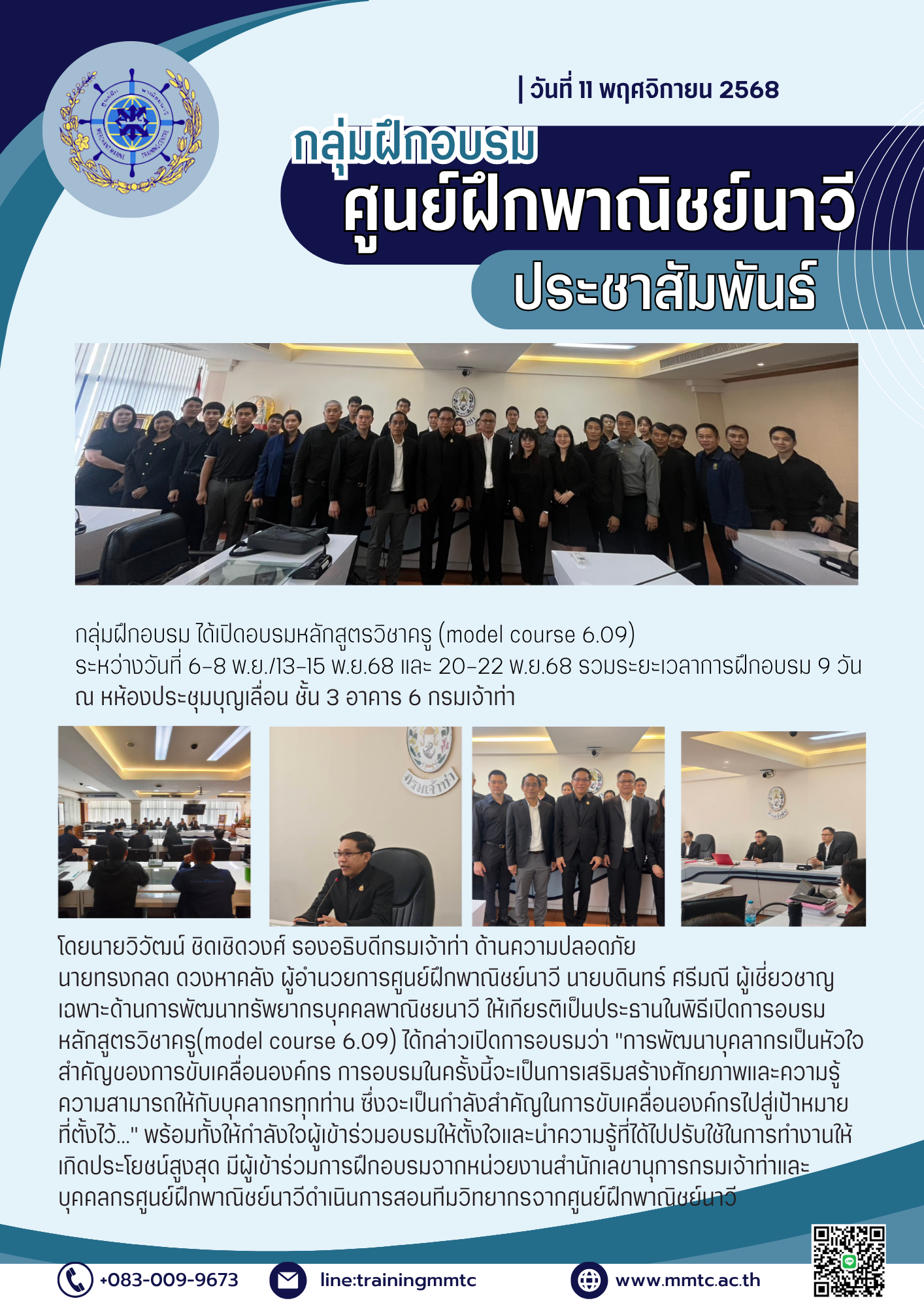 วันพฤหัสบดี ที่ 6 พฤศจิกายน 2568กลุ่มฝึกอบรม ได้เปิดอบรมหลักสูตรวิชาครู (model course 6.09)ระหว่างวันที่ 6-8 พ.ย./13-15 พ.ย.68 และ 20-22 พ.ย.68รวมระยะเวลาการฝึกอบรม 9 วันโดยนายวิวัฒน์ ชิดเชิดวงศ์ รองอธิบดีกรมเจ้าท่า ด้านความปลอดภัย นายทรงกลด ดวงหาคลัง ผู้อำนวยการศูนย์ฝึกพาณิชย์นาวี นายบดินทร์ ศรีมณี ผู้เชี่ยวชาญเฉพาะด้านการพัฒนาทรัพยากรบุคคลพาณิชยนาวี ให้เกียรติเป็นประธานในพิธีเปิดการอบรมหลักสูตรวิชาครู(model course 6.09) ได้กล่าวเปิดการอบรมว่า "การพัฒนาบุคลากรเป็นหัวใจสำคัญของการขับเคลื่อนองค์กร การอบรมในครั้งนี้จะเป็นการเสริมสร้างศักยภาพและความรู้ความสามารถให้กับบุคลากรทุกท่าน ซึ่งจะเป็นกำลังสำคัญในการขับเคลื่อนองค์กรไปสู่เป้าหมายที่ตั้งไว้..." พร้อมทั้งให้กำลังใจผู้เข้าร่วมอบรมให้ตั้งใจและนำความรู้ที่ได้ไปปรับใช้ในการทำงานให้เกิดประโยชน์สูงสุดต่อไปโดยมีผู้เข้าร่วมการฝึกอบรมจากหน่วยงานสำนักเลขานุการกรมเจ้าท่า ณ ห้องประชุมบุญเลื่อน ชั้น 3 อาคาร 6 กรมเจ้าท่าโครงการอบรมหลักสูตรวิชาครู จัดขึ้นเพื่อแผนการพัฒนาเจ้าหน้าที่กรมเจ้าท่าที่เกี่ยวข้องกับภารกิจ IMO เช่น พัฒนาศักยภาพบุคลากรในด้านความรู้ ความเข้าใจ สามารถจัดทำแผนการจัดการเรียนสอนและปฏิบัติการในแผนการสอน มีความรู้ความเข้าใจ สามารถใช้อุปกรณ์ช่วยสอนที่เหมาะสมกับแผนการสอนเข้าใจบ่งชี้ความสัมพันธ์ของผลการเรียนและแผนการสอน สามารถประเมินการเรียนการสอนออกแบบหลักสูตรทางการศึกษาได้และสามารถนำความรู้ที่ได้รับนำกลับไปประยุกต์ใช้กับการที่เกี่ยวข้องต่อไป โดยวิทยากรผู้เชี่ยวชาญจากศูนย์ฝึกพาณิชย์นาวีกลุ่มฝึกอบรมศูนย์ฝึกพาณิชย์นาวี☎️0 2756 4971-80 ต่อ 114/135📲083-009-9673📨www.mmtc.ac.th