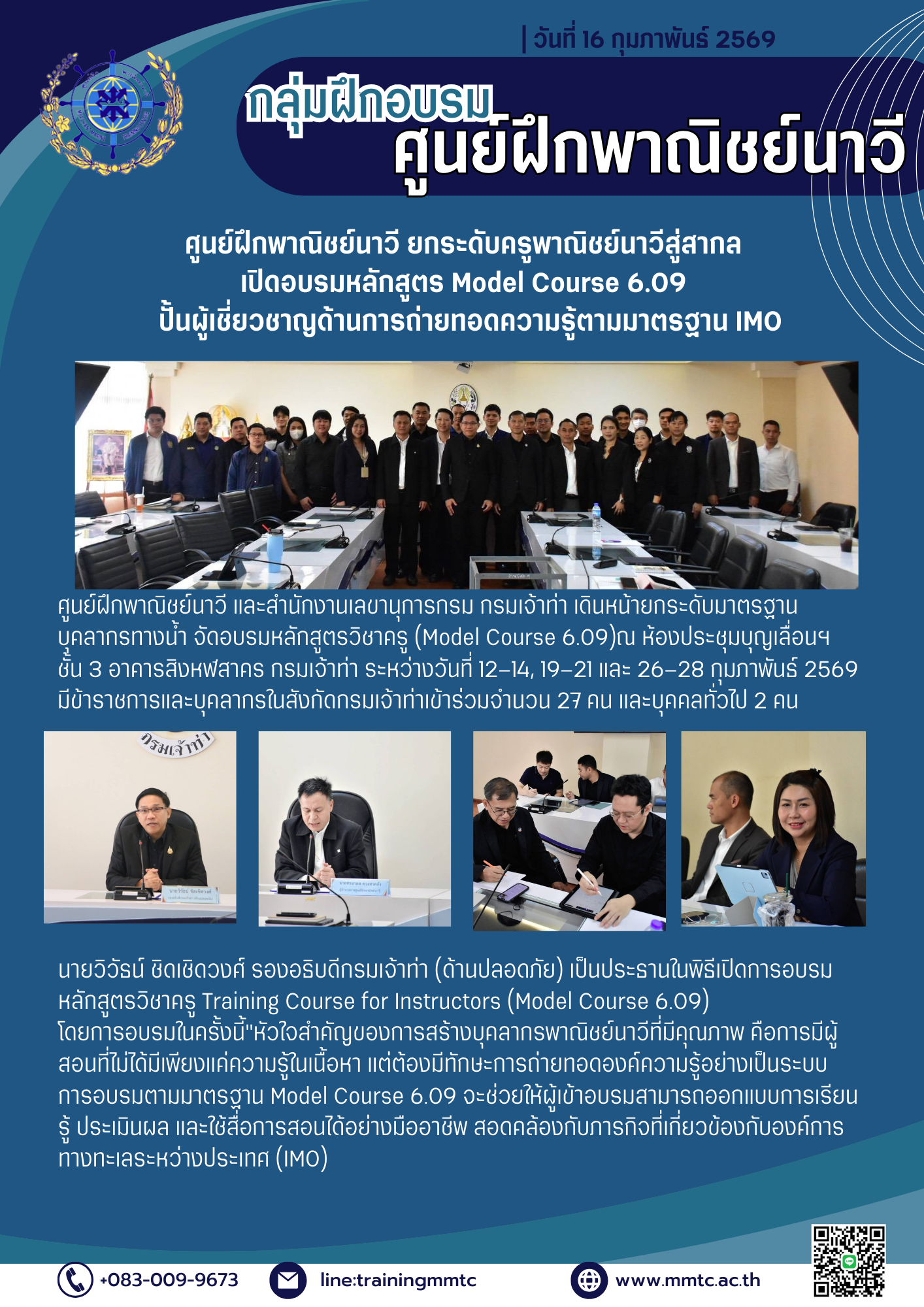 เมื่อวันที่ (12 กุมภาพันธ์ 2569) ศูนย์ฝึกพาณิชย์นาวี และสำนักงานเลขานุการกรม กรมเจ้าท่า เดินหน้ายกระดับมาตรฐานบุคลากรทางน้ำ จัดอบรมหลักสูตรวิชาครู (Model Course 6.09) มุ่งเน้นการพัฒนาทักษะการสอนและเทคนิคการถ่ายทอดความรู้เชิงระบบ เพื่อสร้างบุคลากรพาณิชย์นาวีคุณภาพสูง สอดรับตามมาตรฐานอนุสัญญา STCW และข้อบังคับสากล