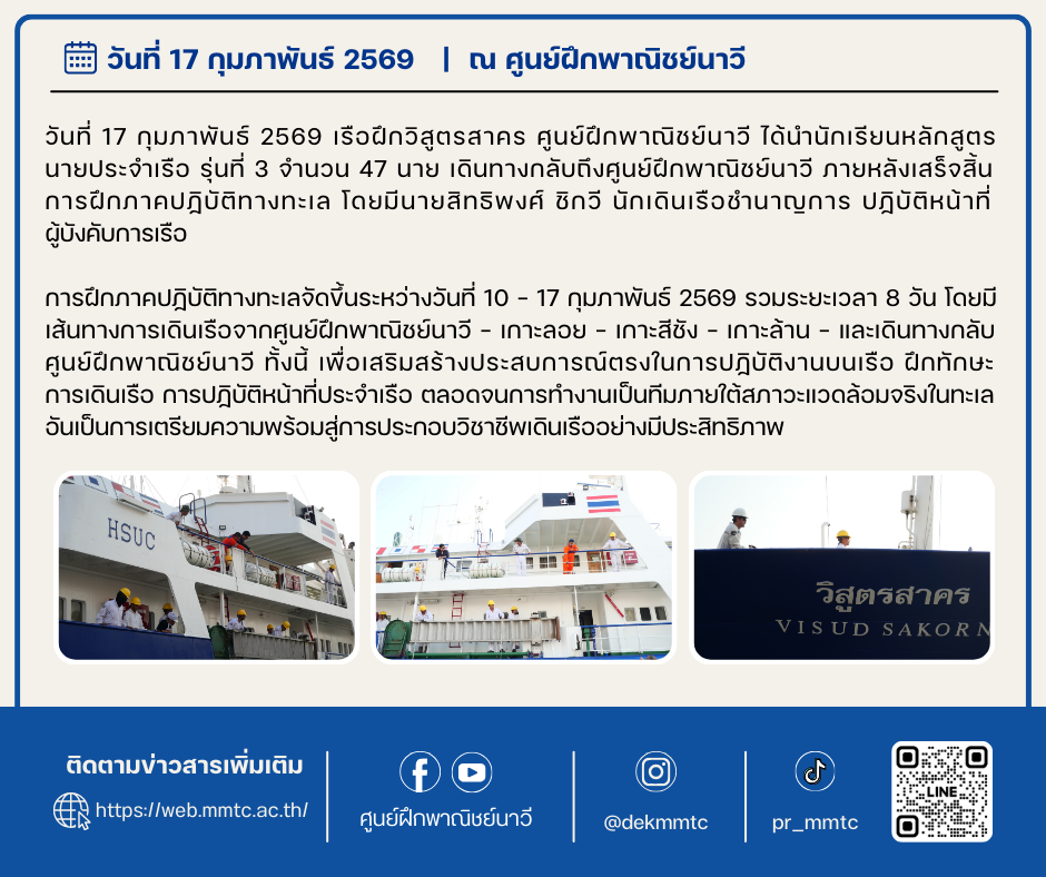 เรือฝึกวิสูตรสาครนำนักเรียนหลักสูตรนายประจำเรือ รุ่นที่ 3 เดินทางกลับถึงศูนย์ฝึกพาณิชย์นาวี